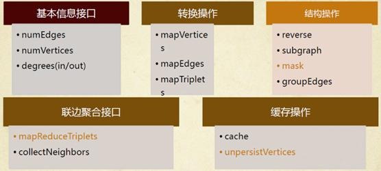 如同Spark一样,GraphX的Graph类提供了丰富的图运算符,大致结构如下图所示。可以在官方GraphX