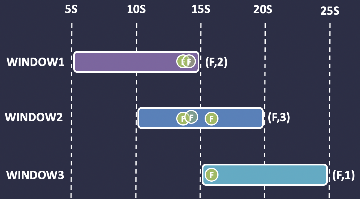 2 ( 10 秒~20 秒 ) 和窗口 3 ( 15 秒~25 秒 ) 。每个窗口发出的最终计数分别为