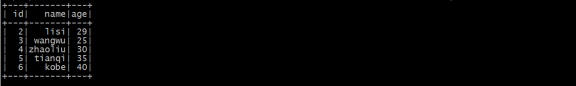 2 lisi 29 3 wangwu 25 4 zhaoliu 30 5 tianqi 35 6 kobe 40 |