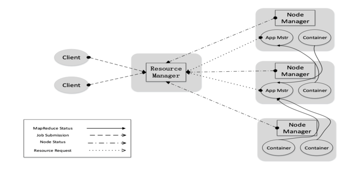 在集群部署方面,YARN的各个组件是和Hadoop集群中的其他组件进行统一部署的。