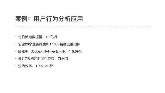 截至16年底,生产环境共有214个Cube,包含的数据总行数为2853亿行,Cube在HBase中的存储有59TB。日查询次数超过了50万次,TP50查询时延87ms,TP99时延1266ms,很好地满足了我们对性能的要求。