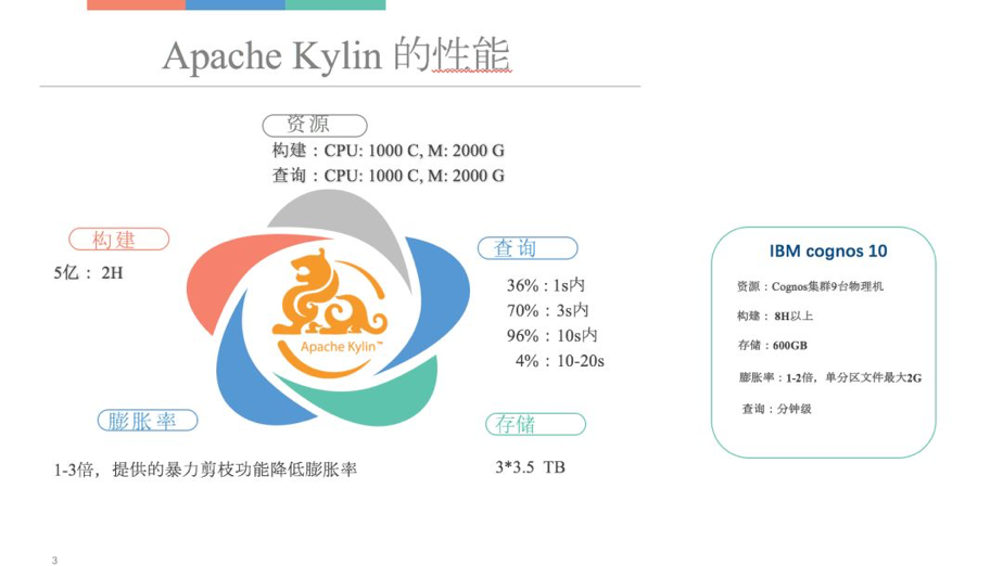 从整个构建性能上来讲, Kylin 相比于 Cognos 也有巨大的提升。因为 Cognos 是单机,没有办法利用分布式集群资源,必须是一个比较独立的