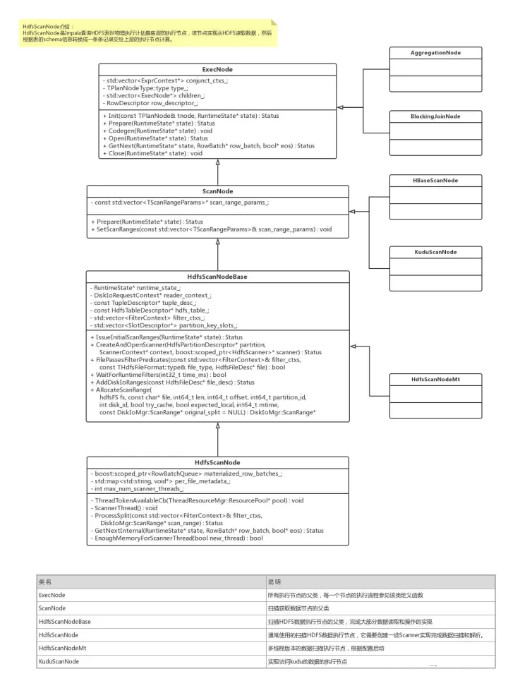 前面我们提到过,HdfsScanNode的作用是从保存在HDFS上的特定格式的文件读取数据,然后对其进行解析转换成一条条记录,将它们传递给父执行节点处理,因此下面介绍的过程主要是在已知扫描哪些数据的情况下返回所有需要获取的记录。在这之前,可以先看一下BE模块的ScanNode的类结构: