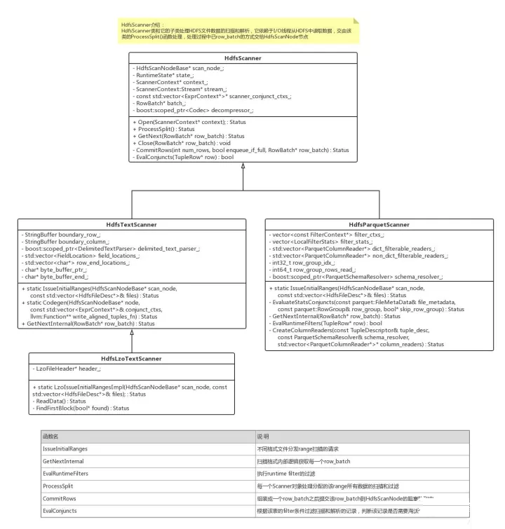 Init函数:该函数在创建ExecNode节点的时候被调用,参数分别是该执行节点的详细描述信息和整个Fragment的上下文。HdfsScanNode初始化的时候会解析runtime