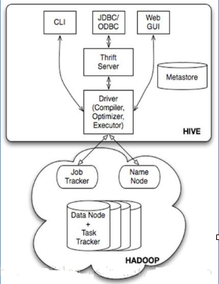 1.) 用户接口主要由三个:CLI、JDBC/ODBC和WebGUI。其中,CLI为shell命令行;JDBC/ODBC是Hive的JAVA实现,与传统数据库JDBC类似;WebGUI是通过浏览器访问Hive。