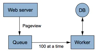 当Web Server收到页面请求时,会将消息添加到队列中。在DB端,创建一个Worker定期从队列中取出消息进行处理,例如每次读取100条消息。这相当于在两者之间建立了一个缓冲。