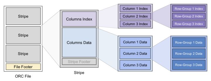 为分区构造索引是一种常见的优化方案,ORC 的数据结构分成以下 3 个层级,在每个层级上都有索引信息来加速查询