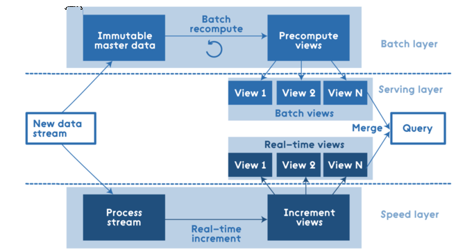 Lambda 架构 针对上面的问题,Nathan Marz提出了一个通用、可扩展和容错性强的数据处理架构即Lambda架构,它是通过利用批处理和流处理方法来处理大量数据的。Nathan Marz的书对从源码的角度对Lambda架构进行了详尽的介绍。 层结构 这是Lambda架构自上而下的层结构:
