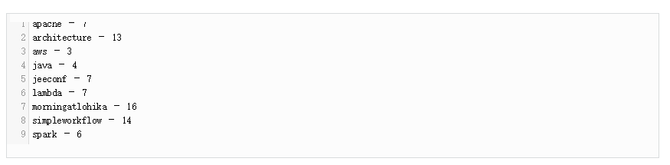 Apache Spark Apache Spark被视为在所有Lambda架构层上进行处理的集成解决方案。 其中Spark Core包含了高级API和支持常规执行图的优化引擎,SparkSQL用于SQL和结构化数据处理,Spark Streaming支持实时数据流的可扩展,高吞吐量,容错流处理。 当然,使用Spark进行批处理的价格可能比较高,而且也不是所有的场景和数据都适合。但是,总体来说Apache Spark是对Lambda架构的合理实现。 示例应用 我们创建一个示例应用程序来演示Lambda架构。这个示例的主要目的统计从某个时刻到现在此刻的#morningatlohika tweets哈希标签。 批处理视图 为了简单起见,假设我们的主数据集包含自时间开始以来的所有tweets。 此外,我们实现了一个批处理,创建了我们的业务目标所需的批处理视图,因此我们有一个预计算的批处理视图,其中包含与#morningatlohika一起使用的所有主题标记的统计信息: