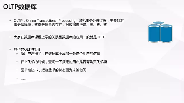 OLTP数据库典型的应用就是用户注册,在数据库里面新添加一条用户的信息,上飞机的时候看一下这个用户有没有买票,进图书馆把书还了等,把还的书从借阅的状态变成未借阅的状态,这很显然是数据的更新、查找,一般不用聚合,这是很典型的OLTP数据库应用。