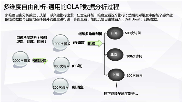 在奥运会期间,全球数以亿计的观众会通过例如电视、PC,安卓等多个平台对比赛进行观看,这样就产生了跨区域、跨平台的海量数据。这时,国双通过技术帮助CNTV(中国网络电视台)进行“用户播放行为分析”。比如某个赛事在北京的收视率如何,各类终端占比是多少。