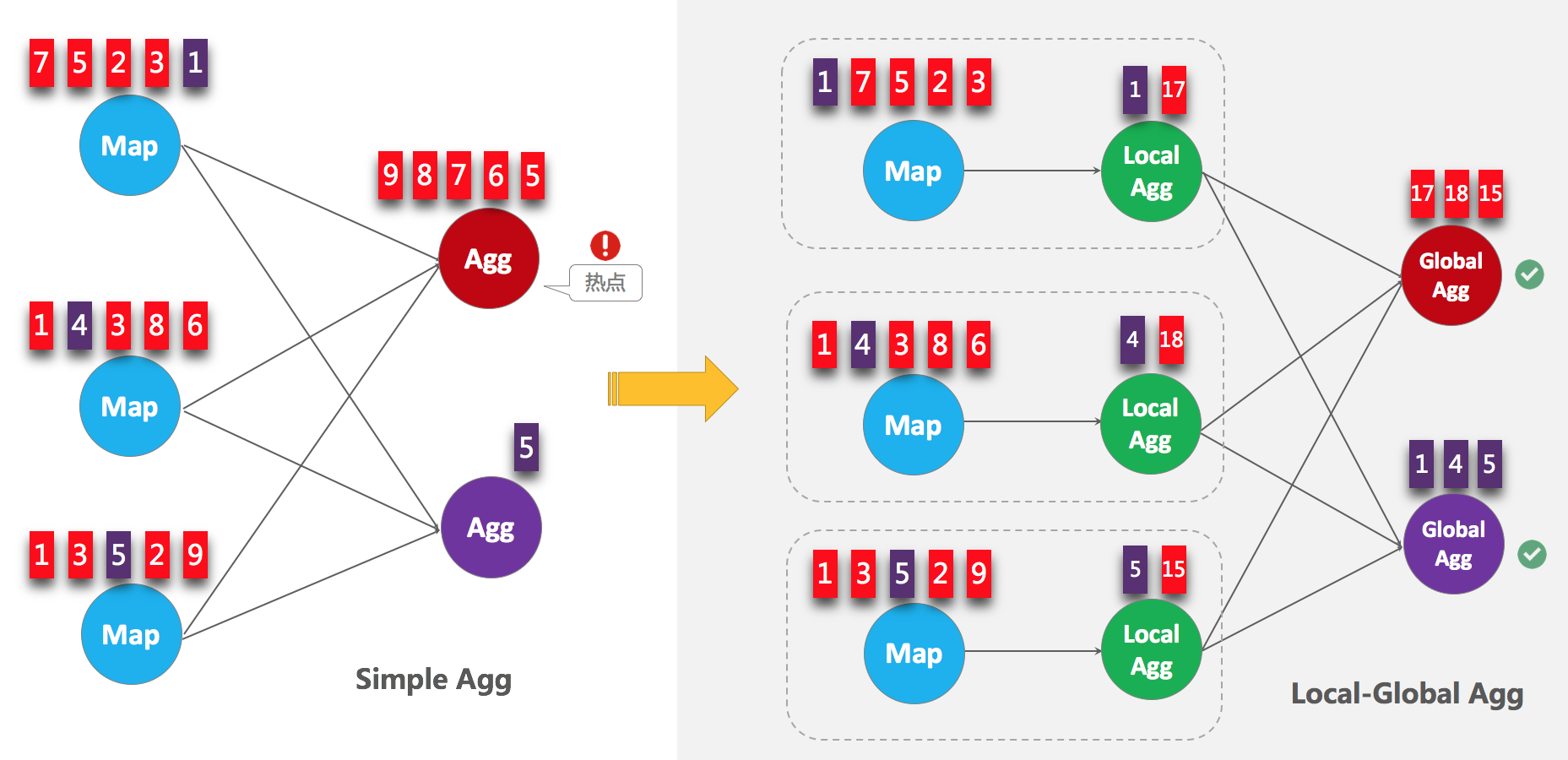 LocalGlobal本质上能够靠LocalAgg的聚合筛除部分倾斜数据,从而降低GlobalAgg的热点,提升性能。您可以结合下图理解LocalGlobal如何解决数据倾斜的问题。