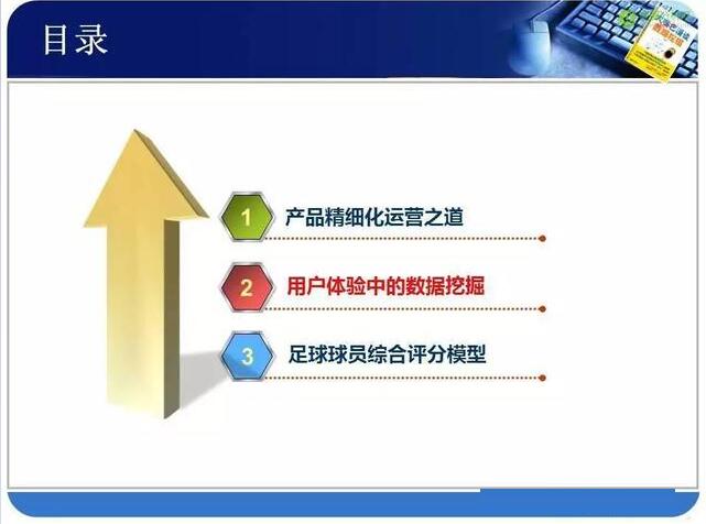 用户体验如何跟数据挖掘结合起来呢?什么是用户体验?用户是使用产品的人,体验是感受,是主观的,而我们进行数据分析或者数据挖掘是基于客观的对象。第一步就需要量化,把主观的体验量化成客观的数据。如何量化用户体验呢?比如形容一种食品特别好吃,食品的体验特别好。可以用“色香味俱全”来形容,这就是量化的东西。色,指颜色,好看,通过视觉来测量。香,通过嗅觉来测量。味,通过味觉,尝一尝来测量。形容一种食品特别好吃,是很主观的,但是可以通过“色香味”这3个可以测量的方面来形容。