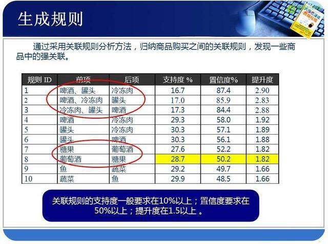 通过以上的分析,最终通过关联规则算法,我们希望支持度和置信度大一些,这里一般会定义一个最小值,这个最小值需要通过业务经验来确定。