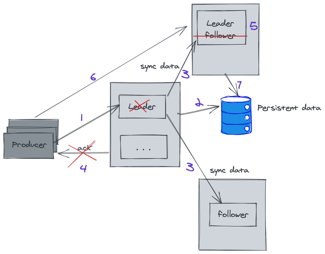 生产者发生消息给 leader ,这个时候 leader 完成数据存储,突然发生故障,没有给 producer