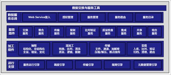Êý¾Ý·þÎñ½»»»ºÍ·þÎñ¹¤¾ßÊÇÊý¾Ý²É¼¯·þÎñ¡¢Êý¾Ý½»»»·þÎñ¡¢Êý¾Ý¼Ó¹¤·þÎñ¡¢Êý¾Ý¹²Ïí·þÎñµÄͳһ֧³Å¹¤¾ß¡£Êý¾Ý·þÎñ¹¤¾ß²ÉÓÃÃæÏò·þÎñµÄ¼Ü¹¹£¬ÌṩÊý¾Ý·þÎñʵÏÖÊý¾Ý½»»»¡¢Êý¾ÝÕûºÏ¡¢Êý¾Ý¸´ÖÆ¡¢Êý¾ÝµÄ´«Êä¡¢Êý¾Ý¹²ÏíµÈ¹¦ÄÜ¡£Ö÷Òª°üÀ¨ÔËÐÐÖ§³Å¡¢¼Ó¹¤×é¼þ¡¢·þÎñ×é¼þ¡¢Êý¾Ý·þÎñ×ÜÏßµÈ×é³É¡£