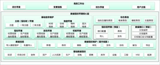 1)Êý¾ÝÖ¸±ê¶¨Ò壺°üº¬Ö¸±êÖ÷Ìâ·ÖÀà¡¢¸÷ÒµÎñÓò¾ßÌåÖ¸±ê¶¨Òå¡¢Ö¸±êÊôÐÔ¼°Ä£Ð͹ÜÀí¡£°üº¬¶ÔÖ¸±êµÄÅúÁ¿¹ÜÀíÒÔ¼°Ö÷Ì⣨¼´Ö¸±êÊ÷£©Î¬»¤£¬ÆäÖÐÖ÷Ìâά»¤Ö÷Òª°üÀ¨¶ÔÖ÷Ìâ¡¢Ò»¼¶Ö÷Ìâ¡¢¶þ¼¶Ö÷ÌâµÄά»¤¡£ÆäÖÐÖ÷Ì⺬Ͷ×Ê¡¢Êг¡·ÖÎö¡¢²ÆÎñ¡¢×ʲú¡¢ÈËÁ¦×ÊÔ´¡¢Éú²ú¡¢²É¹º¡¢ÏúÊÛ¡¢¿â´æ¡¢É豸¡¢¹¤³Ì¡¢HSE¡¢ÄÜÔ´¶þÊ®´óÀàÏÖÓÐÒµÎñÖ÷Ìâ¡£