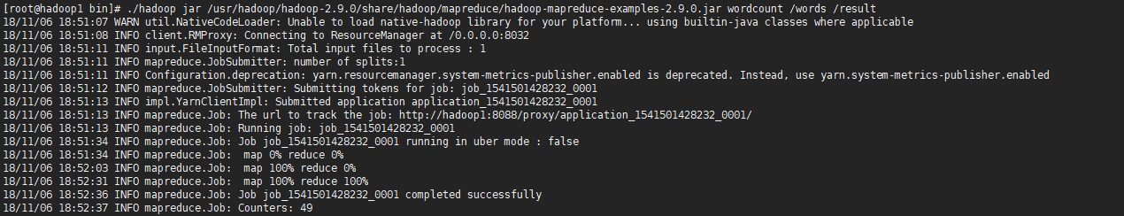 2.使用Hadoop提供的hadoop-mapreduce-examples-2.9.0.jar执行wordcount词频统计功能