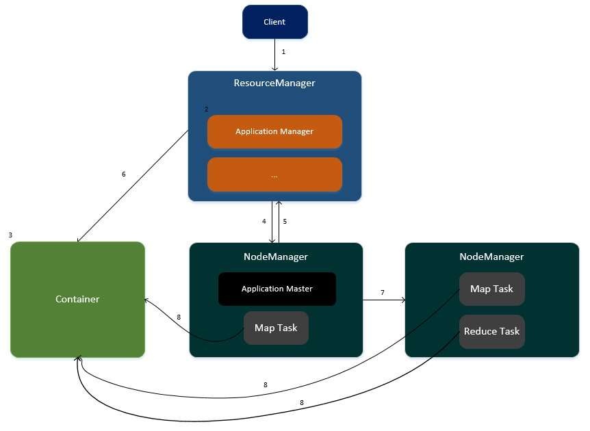 8.各个NodeManager从Container容器中获取资源并执行Map、Reduce任务。