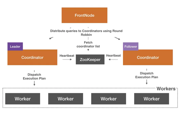 FrontNode在接收到用户的查询之后会把请求按照Round Robin的方式发送给底层的多个Coordinator,这样多个Coordinator就可以分担压力,但是整个集群还是有一些全局的事情要有单个Coordinator来做,比如Presto的Worker状态监控、OOM