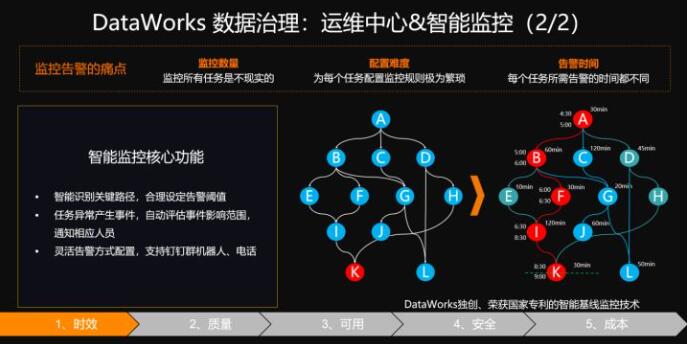 以上可以看到,这是一款DataWorks独创的,并且已经获得了国家专利的智能基线监控技术。可以看到上图的K节点,你只要关心你整个数据最后产出的节点,而无需关注它的上游节点,DataWorks会非常智能的帮你搜索遍历它的上游节点,并且找出它的关键路径,在关键路上的每一个节点设置相应的智能监控和告警,这样就可以提前的发现问题,及时干预。