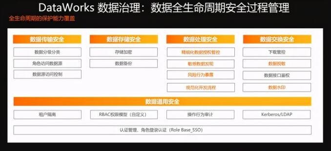我们除此以外还提供了一个全链路的数据安全的保护。数据安全领域我们提供了租户隔离Role Base的权限管理,操作行为的日志,并且跟开源的Kerberos/LDAP是打通的。除此以外,对整个数据的开发链路其实也是有一个全链路的安全保障的,从数据传输开始,比如说我们可以对数据传输数据源的访问进行控制,在数据存储的过程中可以进行存储加密,数据的备份和恢复,在数据处理的过程中可以进行更细力度安全管控,随后的数据交换数据下载,然后会进行相应的接口的鉴权,以及进行数据脱敏的处理。