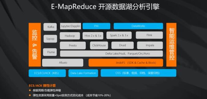 整个EMR的产品可以run在ACK上,也可以run在ECS上面,利用ECS和ACK的弹性伸缩的能力,我们让整个数据湖分析变得低成本。