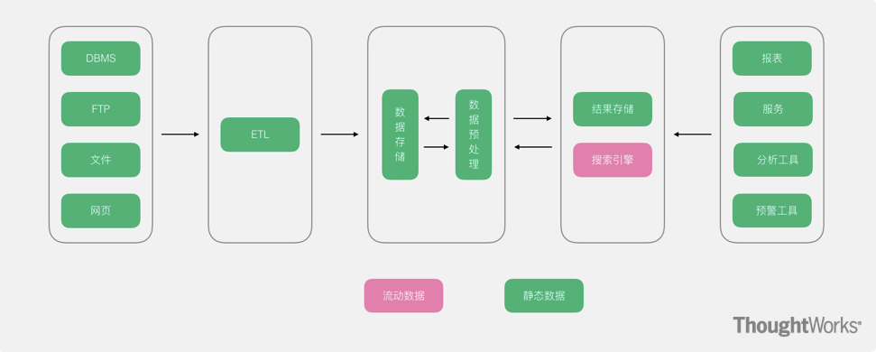 数据从底层的数据源开始,经过各种各样的格式进入大数据平台,在大数据平台中经过Kafka、Flume等数据组件进行收集,然后分成两条线进行计算。一条线是进入流式计算平台(例如