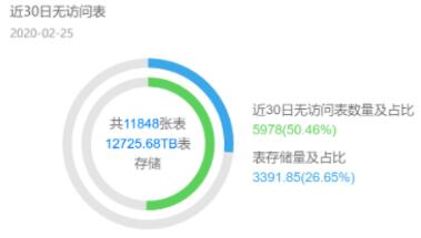 先来看一组统计数据,这是某数据中台项目,表相关的使用统计。从中你可以发现,有一半的表在 30 天内都没有访问,而这些表占用了