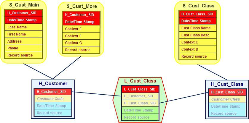 DataVault是Dan Linstedt发起创建的一种模型方法论,它是在ER关系模型上的衍生,同时设计的出发点也是为了实现数据的整合,并非为数据决策分析直接使用。它强调建立一个可审计的基础数据层,也就是强调数据的历史性可追溯性和原子性,而不要求对数据进行过度的一致性处理和整合;同时也基于主题概念将企业数据进行结构化组织,并引入了更进一步的范式处理来优化模型应对源系统变更的扩展性。它主要由:Hub(关键核心业务实体)、Link(关系)、Satellite(实体属性)三部分组成 。