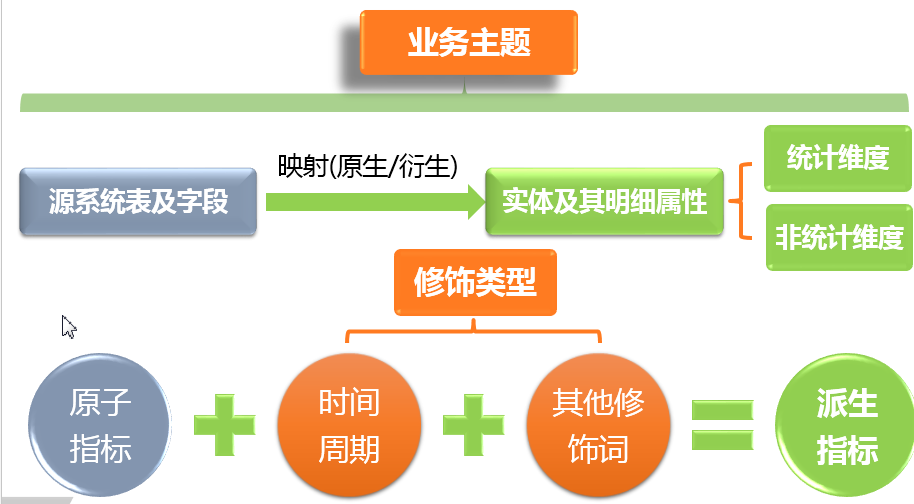 将此前个性化的数据指标进行规范定义,抽象成:原子指标、时间周期、其他修饰词等三个要素。