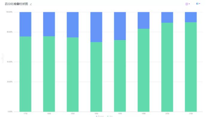 - 百分比堆积柱状图:适合展示同类别的每个变量的比例;