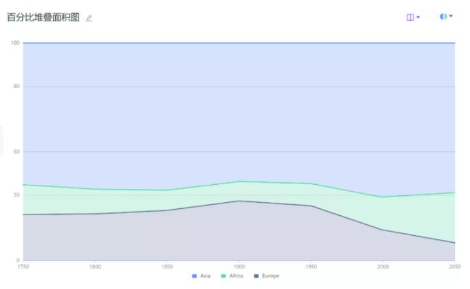 - 百分比堆积面积图。比较同类别的各个变量的比例差异;