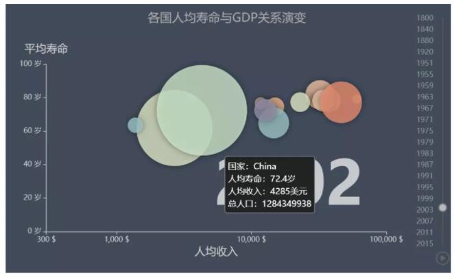 注意事项: 气泡图的数据大小容量有限,气泡太多会使图表难以阅读。但是可以通过增加一些交互行为弥补:隐藏一些信息,当鼠标点击或者悬浮时显示,或者添加一个选项用于重组或者过滤分组类别。另外,气泡的大小是映射到面积而不是半径或者直径绘制的。因为如果是基于半径或者直径的话,圆的大小不仅会呈指数级变化,而且还会导致视觉误差。