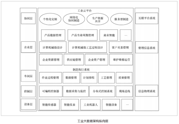 工业大数据架构的企业纵向层从物理 域的角度自下而上共分为5层,分别为 设备层、控制层、车间层、企业层和协同层 。在设备层、控制层、车间层可利用物联网,基于信息物理系统实现智能工厂;在企业层,企业集成内部各种信息化应用,进行企业内部业务流程整合和改造,提升企业运行 效率;协同层使用工业云等平台技术,实 现企业外部协同制造及制造业服务化等创新业务模式。企业纵向维度可以分成信息物理系统、企业管理信息系统、互联平台系统3个子系统