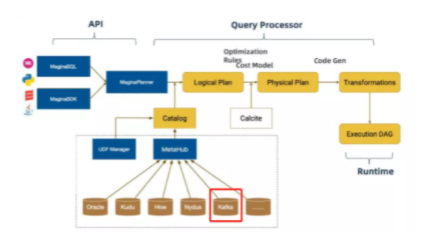 基于 Flink 1.0 版本我们做了一个 Magina 版本的重构,在 API 层次我们提供了 Magina SQL 和 Magina SDK 贯穿 DataStream 和 SQL 操作;然后通过自定义 Magina SQL Parser 会把这些 SQL 转换成 Logical Plan,在将 LogicalPlan 转化为物理执行代码,在这过程中会去通过 catalog 连接元数据管理中心去获取一些元数据的信息。我们在 Kafka 的使用过程中,会将 Kafka 元数据信息登记到元数据中心,对实时数据的访问都是以流表的形式。在 Magina 中我们对 Kafka 的使用主要做了三部分的工作: