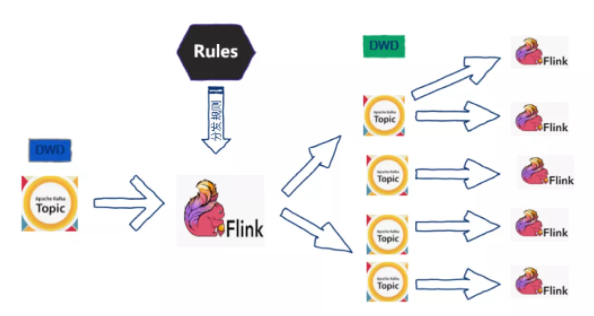 我们想到把大的 Topic 进行实时分发来解决上面的问题,基于 Flink 1.5 设计了如下图所示的数据分发的程序,也就是实时数仓的雏形。基于这种将大的 Topic 分发成小的 Topic 的方法,大大减轻了集群的压力,提升了性能,另外,最初使用的是静态的分发规则,后期需要添加规则的时候要进行任务的重启,对业务影响比较大,之后我们考虑了使用动态规则来完成数据分发的任务。