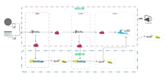 下图是基于 Flink 和 Kafka 的 Lambda 架构在云音乐的具体实践,上层是实时计算,下层是离线计算,横向是按计算引擎来分,纵向是按实时数仓来区分。