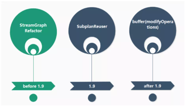 于是我们想,是否可以避免临时中间结果的多次消费。在 1.9 版本之前,我们进行了 StreamGraph 的重建,将三个 DataSource 的 DAG 进行了合并;在 1.9 版本,Magina 自己也提供了一个查询和 Source 合并的优化;但是我们发现如果是在同一个 data update 中有对同一个表的多个 Source 的引用,它自己会合并,但是如果不是在同一个 data update 中,是不会立即合并的,于是在 1.9 版本之后中我们对 modifyOperations 做了一个 buffer 来解决这个问题。