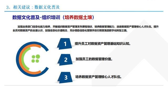 第三个要培养数字资产管理的核心人才队伍。所以要在企业里面建立数据文化,数据知识普及,包括数据的一些认证。