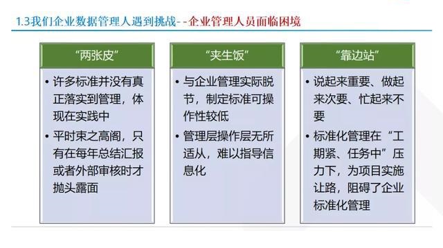 第三个“靠边站”。整个数据治理、数据变化,说起来重要,做起来次要,忙起来就不要。整个数据标准化管理工作在公司任务紧的这个压力下面为项目往往让路,阻碍了整个企业数据标准化的进展。