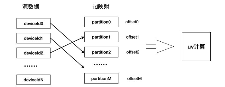 • 字典方案:将 string 类型的 deviceld 转成 long 类型,方便后续的 uv 计算;