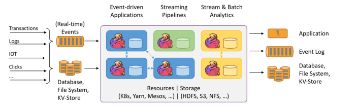 Flink 可以运行在 k8s、yarn、mesos 等资源调度平台上,依赖 hdfs 等文件系统,输入包含事件和各种其他数据,经过
