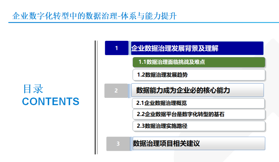 第一部分是企业数据治理发展背景及理解,这里面主要讲数据治理面临的挑战和难点和数据治理发展的趋势。