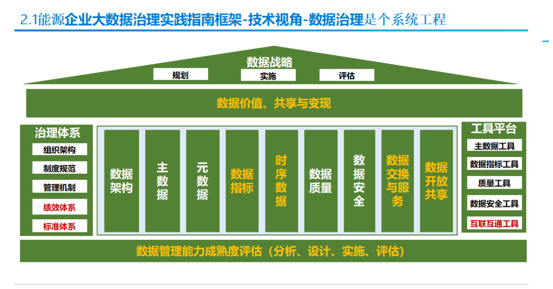 企业的数据系统很多通过数据交换的服务来构建数据。数字开放共享能够实现它的价值。后面是数据治理的整个能力,才能做评估。这是技术的设想,是体现了工程。包含战略、体系、工具、数据治理的职能域。