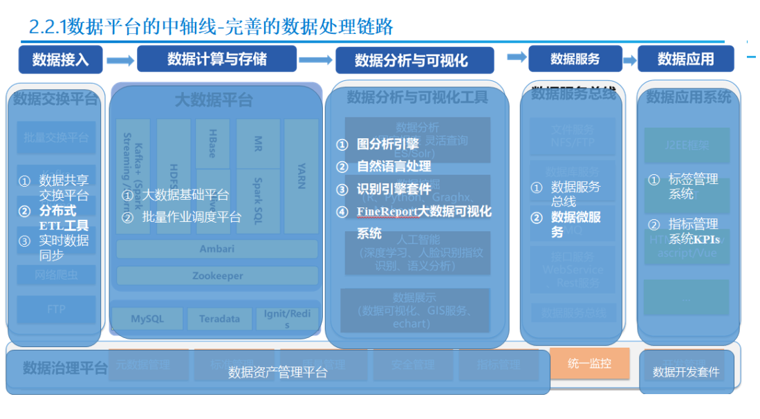 那接下来看一看这里面的数据采集,交换,数据计算与存储,数据分析与建模,数据应用,数据治理的体系。