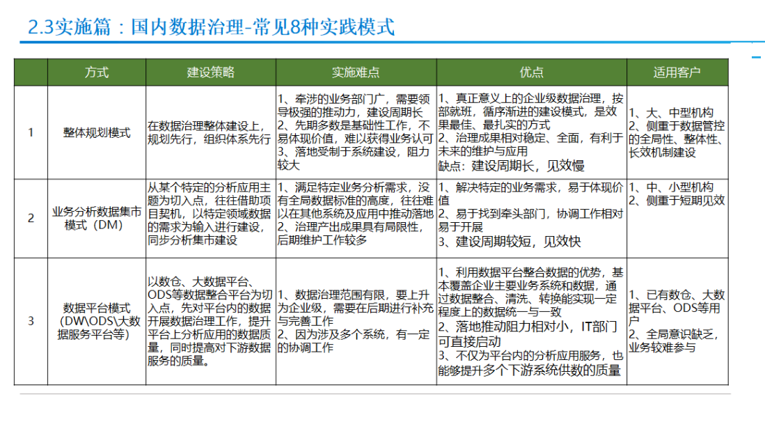 第一个是有整体规划,一个大机构让我们做总体规划,规划3-5年的。数据治理的项目按部就班的走,当然很多政府和大型机构是采用整体规划的方式,在数据治理的整体实现上,规划先行,组织体系先行,这是一种方法。缺点就是建设周期长、见效慢,但是治理成果相对稳定全面。