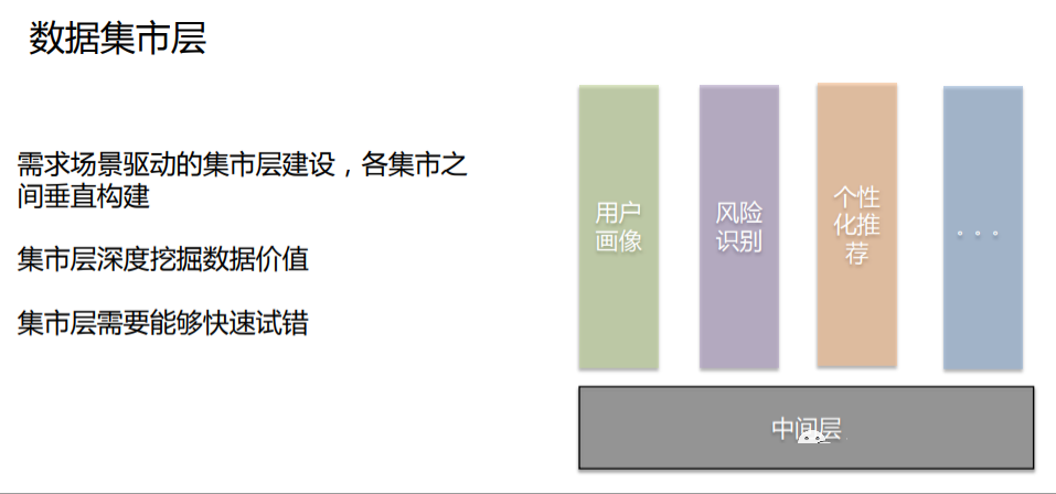数据集市层是上下三层架构的最上层,通常是由需求场景驱动建设的,并且各集市间垂直构造。在数据集市层,我们可以深度挖掘数据价值。值得注意的是,数据集市层需要能够快速试错。