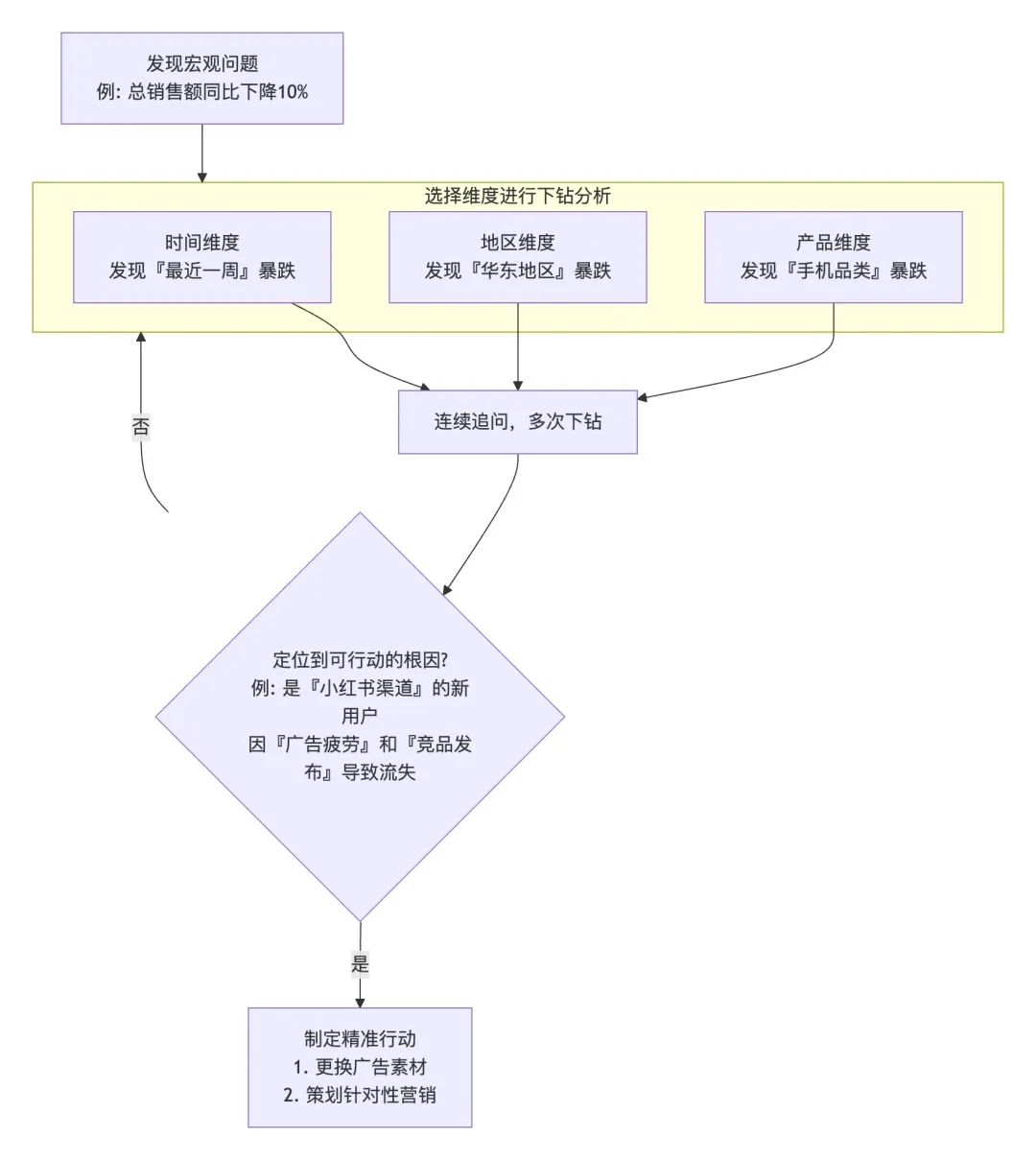 通过层层下钻,你从“GMV下跌15%”这个宏观问题,精准定位到了一个微观的、可行动的具体问题: