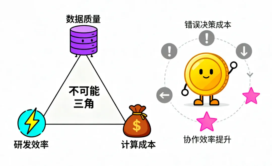 任何数据质量讨论都必须始于承认一个核心矛盾:数据质量、研发效率、计算成本 构成一个“不可能三角”。追求极致质量必然牺牲效率和成本。我们的目标不是追求100%准确,而是找到